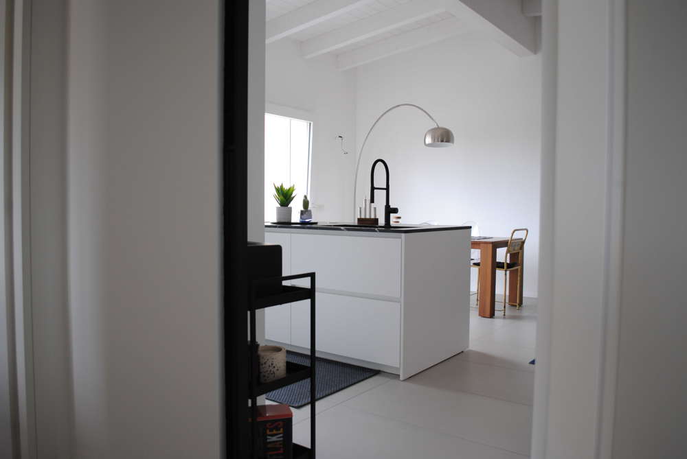 Prima abitazione: accesso sulla destra, ampio open space che integra cucina e zona pranzo. Le vetrate collegano il salone al portico, che si apre sull'ampia area esterna. Nella zona notte, camera matrimoniale con bagno e locale studio per il lavoro e la creatività.