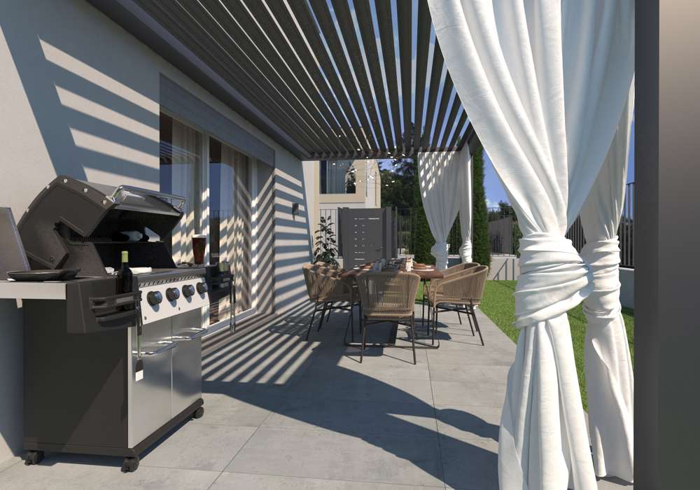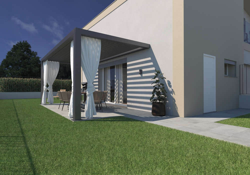 Vai al Virtual TourPiano terra: Giardino privato con pergola, box doppio, anticamera con bagno di servizio, ampia zona giorno con cucina open space e grandi finestre che illuminano l’ambiente.