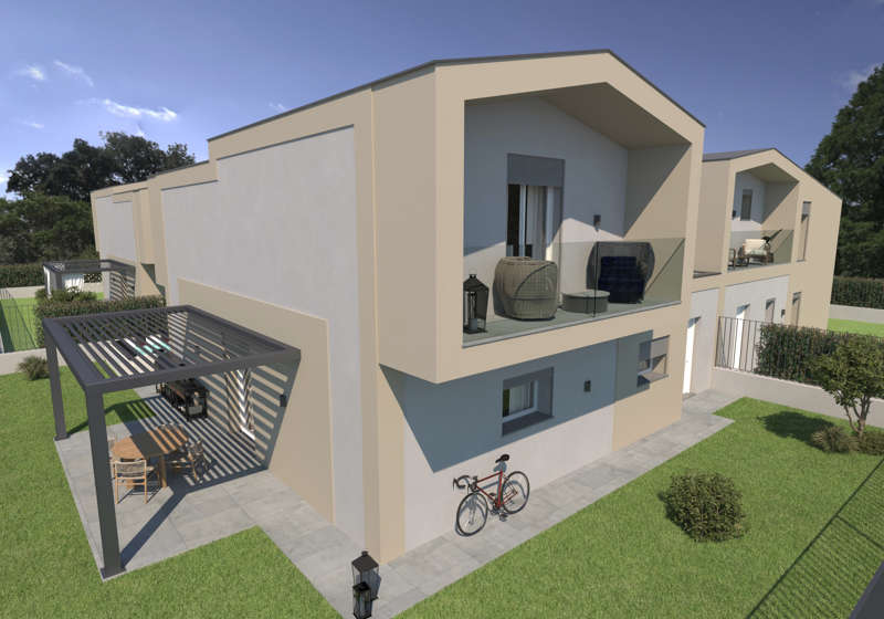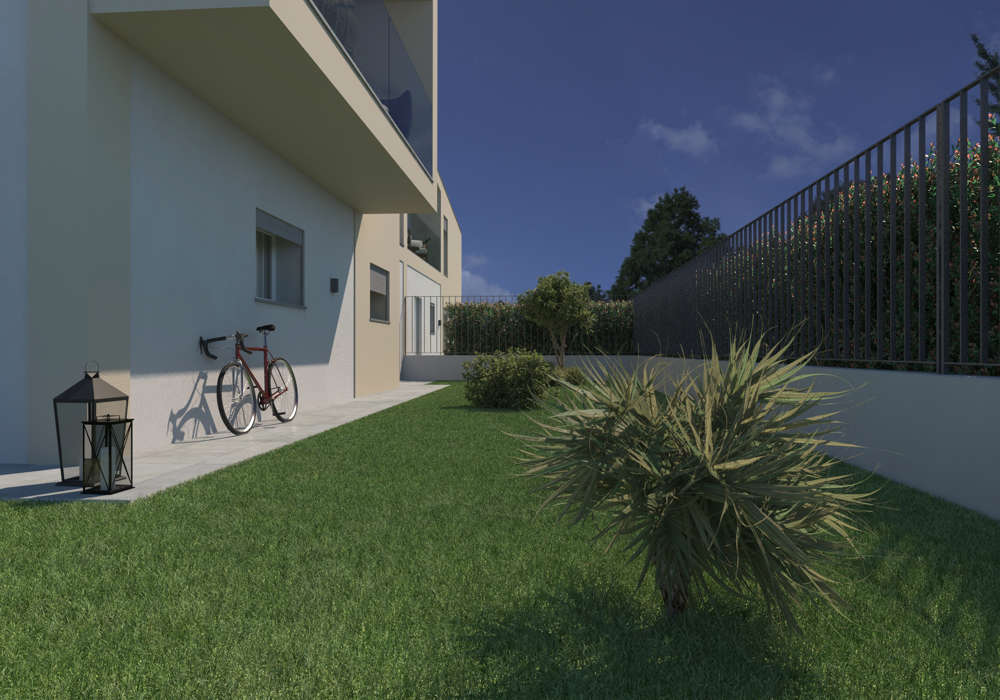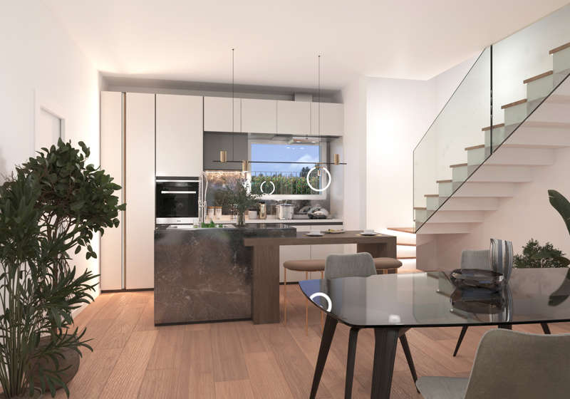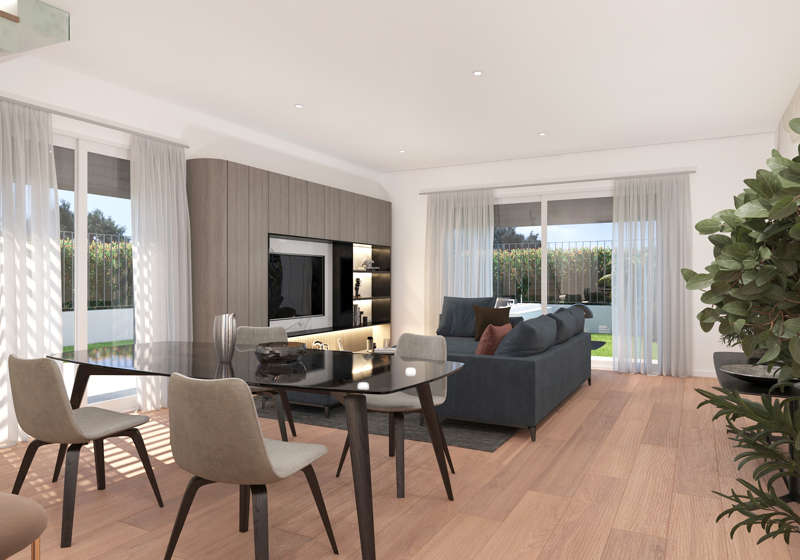 Vai al Virtual TourPiano terra: Giardino privato, box doppio con area lavanderia, bagno di servizio, ampio open space con cucina a isola, zona pranzo e living, illuminati da grandi vetrate che portano la luce naturale al centro della casa.