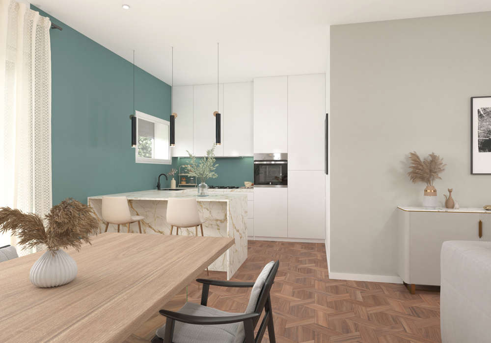 Vai al Virtual TourPiano terra: Giardino privato con pergola, box doppio con accesso diretto all’abitazione, anticamera con bagno per gli ospiti, zona lavanderia riservata, ampio salone open space con cucina a penisola, zona pranzo e area relax, illuminato da grandi finestre che collegano l’interno con l’esterno.