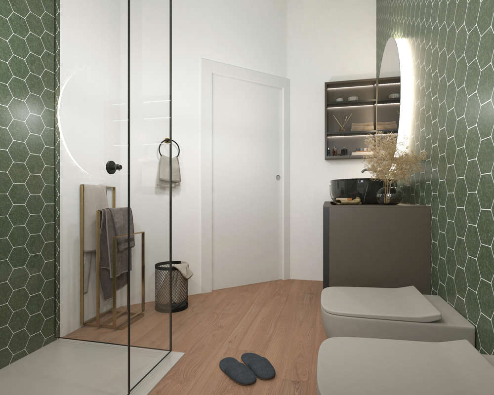 Piano primo: Camera matrimoniale con cabina armadio e balcone privato, due camere singole con balcone comunicante, bagno elegante con doppio lavabo, disimpegno funzionale per la zona notte.