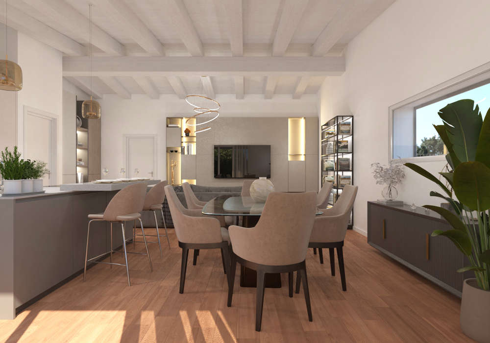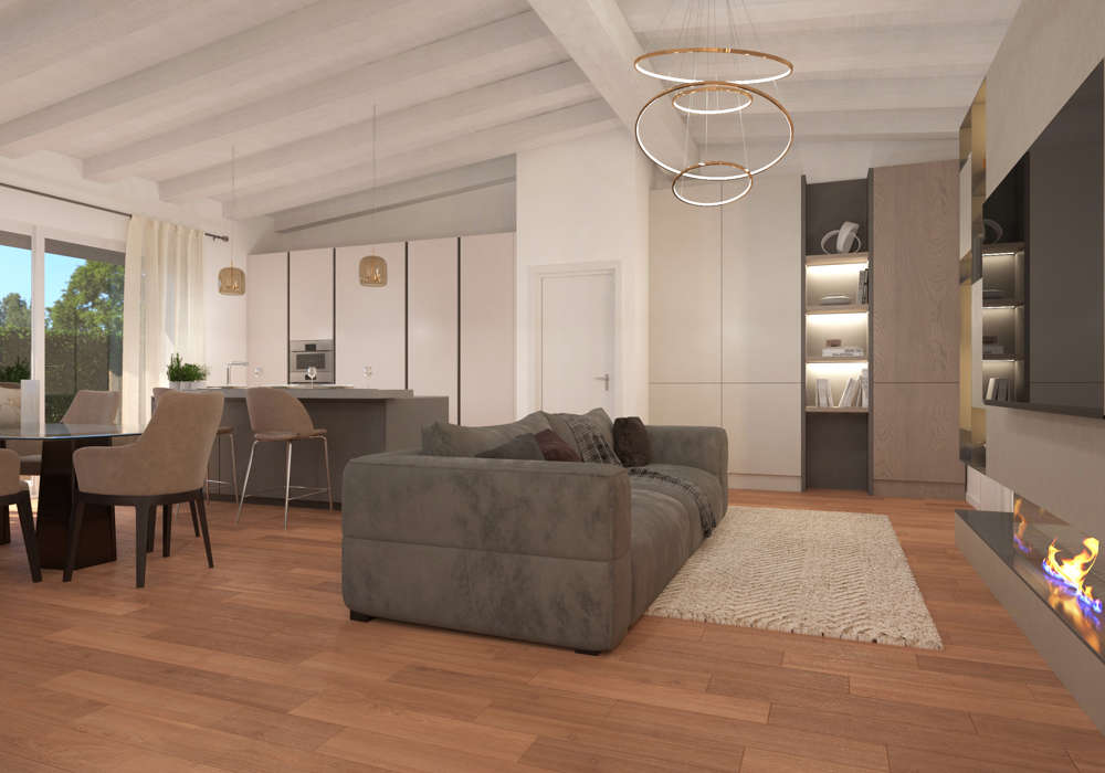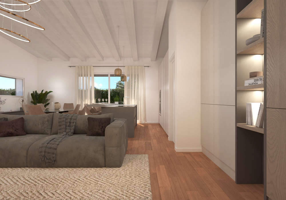 Il cuore di Villa Marcella è un ampio open space con cucina a isola e living, progettato per garantire spazi fluidi e funzionali. Le grandi vetrate permettono alla luce naturale di illuminare ogni ambiente e offrono una vista costante sul giardino di 690 mq, creando un dialogo continuo tra interno ed esterno. Sullo stesso livello troviamo il box doppio collegato all’abitazione, con locale tecnico e lavanderia, per una gestione pratica e ordinata della vita quotidiana.