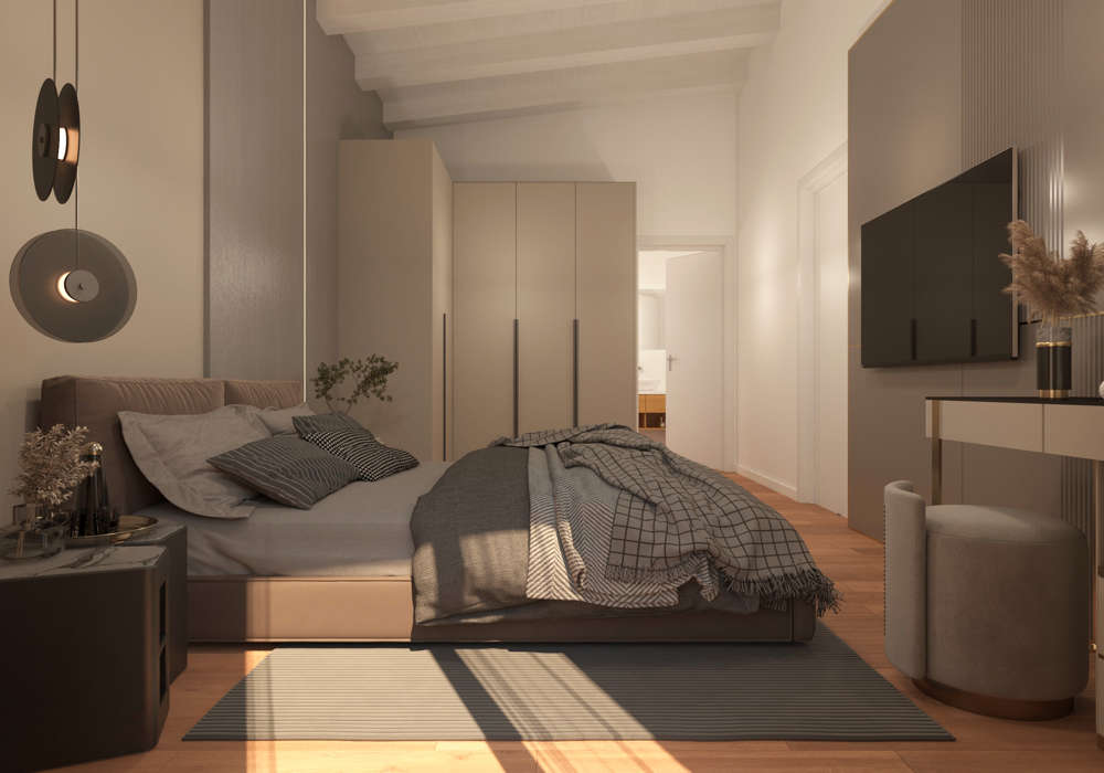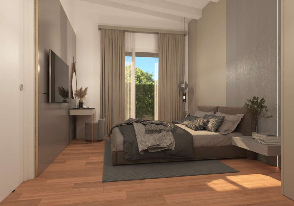 Il corridoio separa la zona giorno dalla zona notte, garantendo privacy e tranquillità. Qui si trovano due camere spaziose, un bagno e una camera matrimoniale con bagno privato dotato di vasca, pensata come suite intima e confortevole. Ogni ambiente è valorizzato dalle ampie finestre, che assicurano luminosità e un contatto costante con il verde circostante.