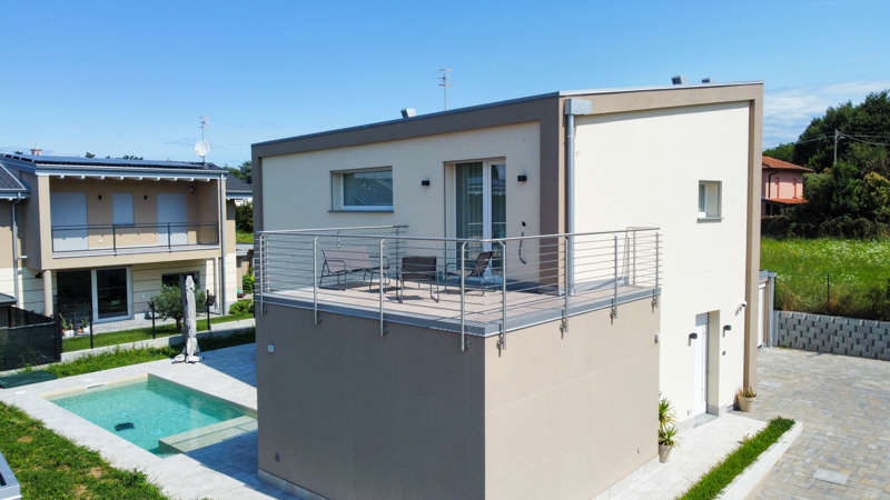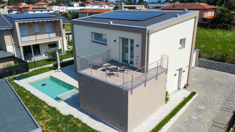 Tecnologie: sistema domotico B-TICINO MYHOME-UP, tapparelle motorizzate, pavimenti riscaldati, sanitari sospesi e impianto fotovoltaico, garantendo comfort, sicurezza ed efficienza energetica.