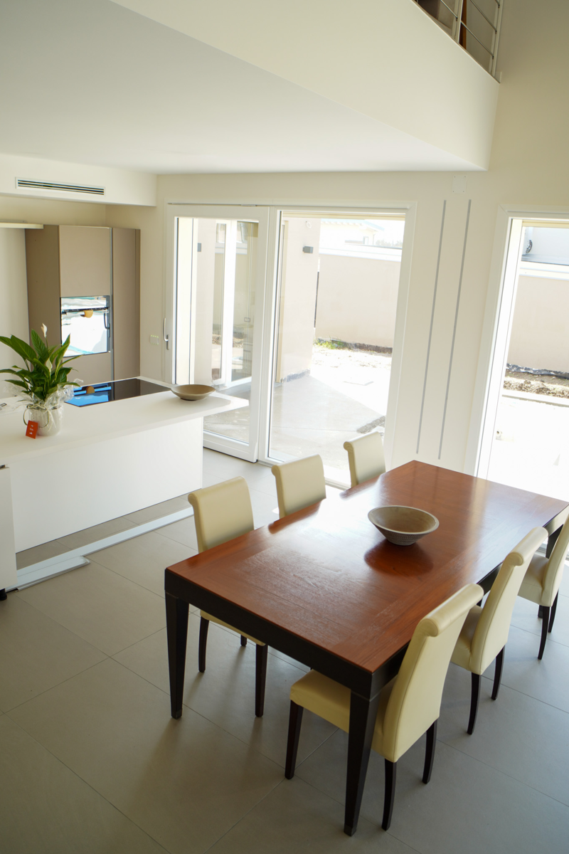 Questa villa disposta su due piani è circondata da verde e natura. Si trova in un complesso residenziale ecosostenibile, collegata ai servizi essenziali del Comune.