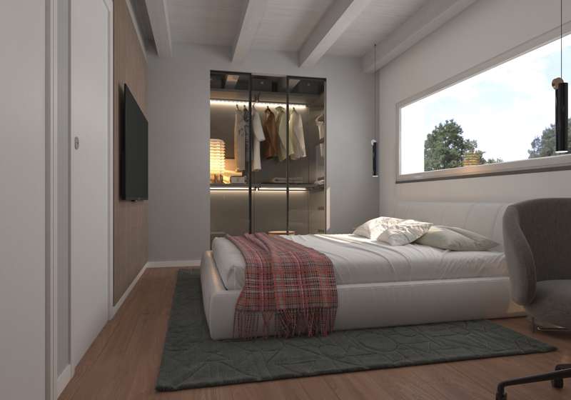 Piano primo: una camera matrimoniale padronale con cabina armadio privata, due camere singole anch’esse dotate di cabina armadio e due bagni moderni, garantendo comfort e privacy per tutta la famiglia.