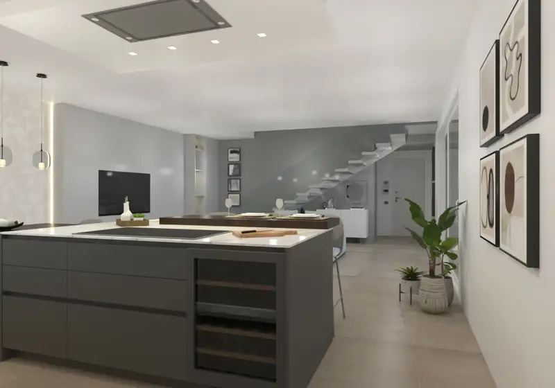 Piano terra: spaziosa zona living con cucina open space, caratterizzata da eleganti vetrate panoramiche, bagno di servizio, lavanderia separata e box doppio con locale tecnico.
