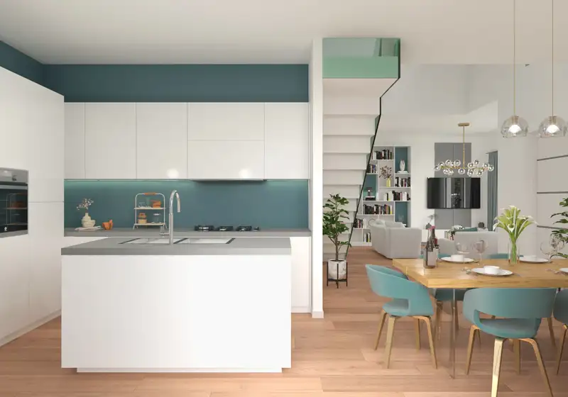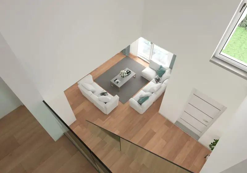 Piano terra: ingresso spazioso e luminoso, zona giorno open space composta da soggiorno e sala da pranzo con cucina a vista, uno studio riservato, un bagno moderno e un’area di servizio con locale